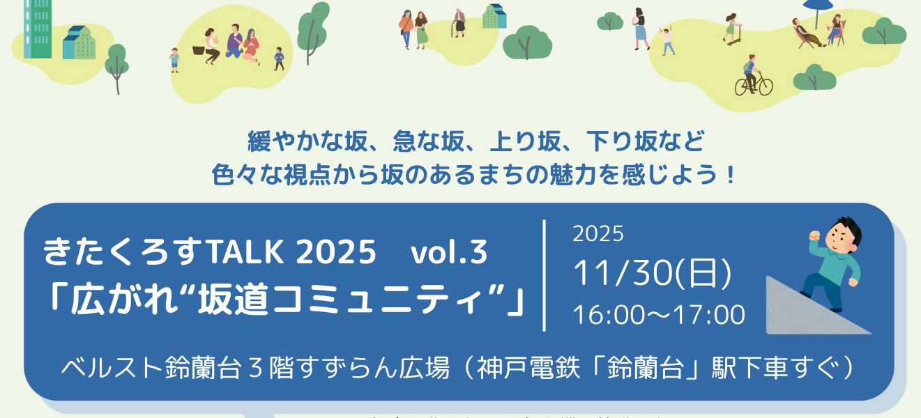 鈴蘭台の物件も取り扱われている不動産事業の方をファシリテーターとし、神戸親和大学でスポーツ教育を教えられている教授や、坂アンバサダーで自転車屋さんをされている方、北区市民ランナー(北区地域協働課の職員)に登壇いただき、「坂のあるまちの魅力」について話します。